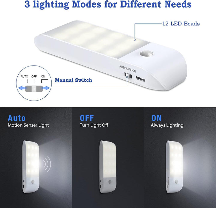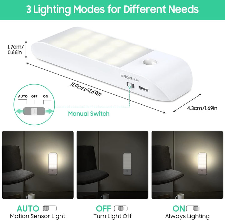 Rechargeable Motion Sensor Night Lights (2 Pack) | 12-LED 4000K Stick-On Cupboard Lights | Type-C USB Rechargeable for Wardrobe, Hallway, Bedroom