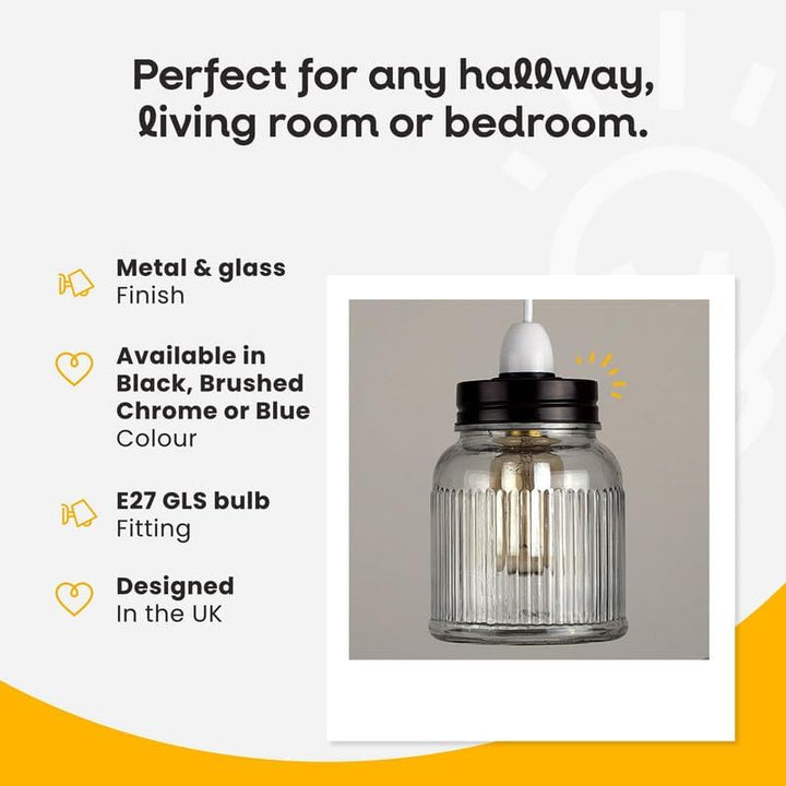 Add timeless elegance to your home with this Retro Style Brushed Chrome and Clear Ribbed Glass Jar Ceiling Pendant Light Shade. Featuring a beautifully ribbed glass design and a sleek brushed chrome metal lid, this ceiling shade combines vintage charm with modern appeal. Easy to install—no electrical work required—it instantly upgrades your space with warm, ambient lighting. Ideal for kitchens, dining rooms, bedrooms, or hallways, this versatile pendant shade fits seamlessly into any décor style.