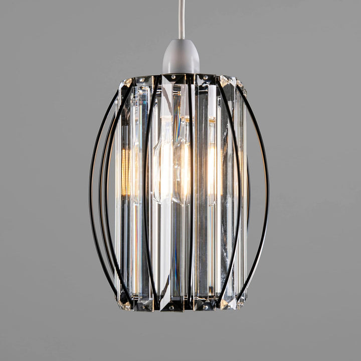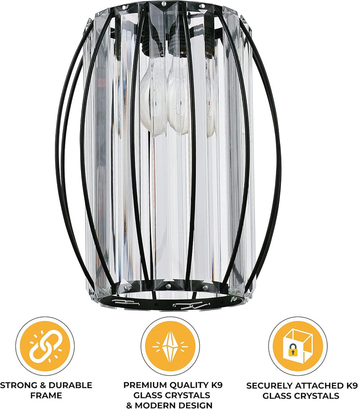 Add a touch of luxury to your home with this elegant Small Black Crystal Light Shade, featuring a sleek cylindrical design with oval rings and premium clear iridescent K9 crystals. The crystals beautifully refract and reflect light, allowing maximum brightness to pass through and creating a stunning visual effect in any room.