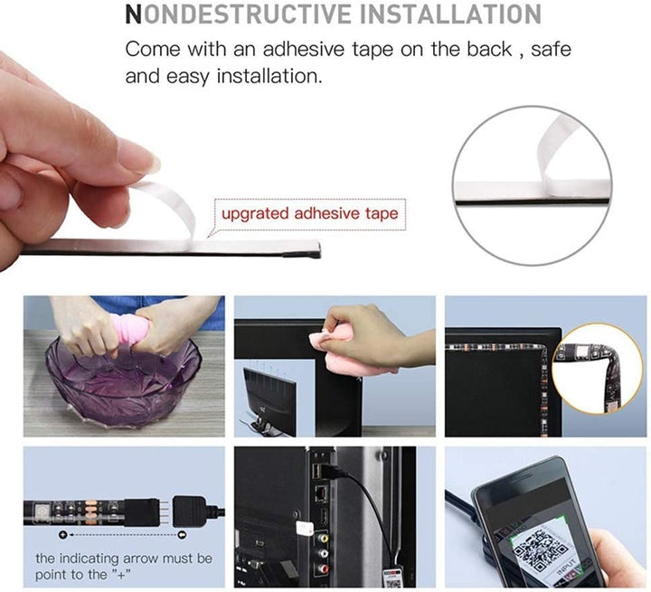 You just need to connect all the parts together, peel off the protective layer, and then stick to a clean, dry, flat surface. These multi-color changing LED strip lights can be cut into every 3 LEDS along with cutting marks, which will not damage the rest of the light strips.