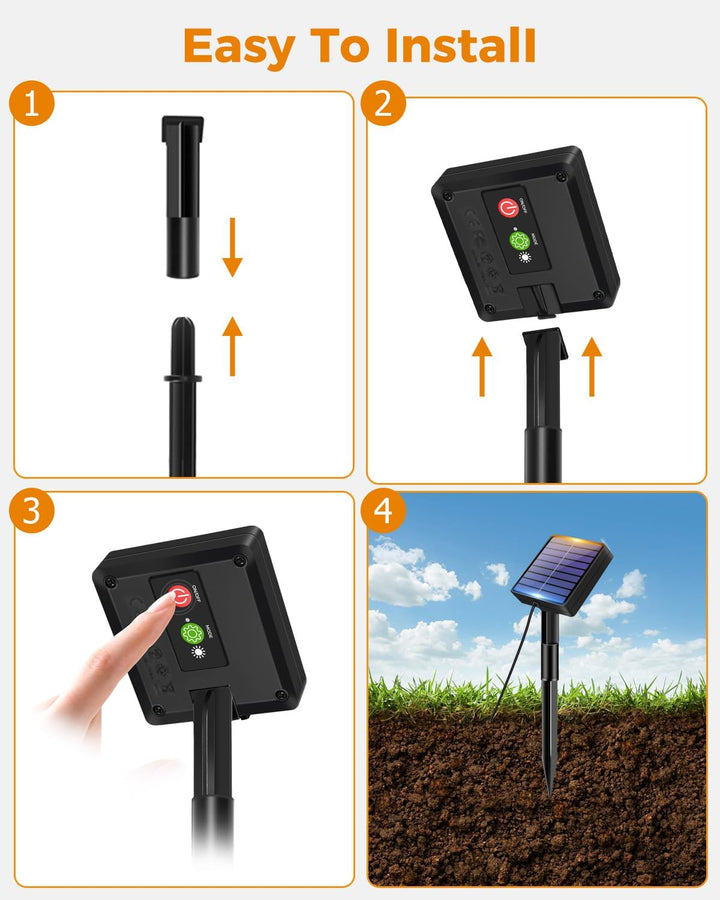 Easy Installation – No wiring required; set up in minutes with solar panel and ground stake.