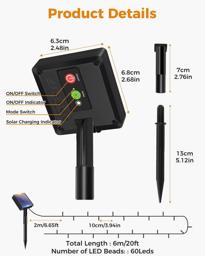 Add a warm, romantic glow to your outdoor spaces with the 6M/20FT Solar Garden String Lights, featuring 60 high-quality warm white LEDs that bring charm and elegance to any occasion. These solar-powered fairy lights are perfect for decorating gardens, trees, patios, fences, balconies, and parties.