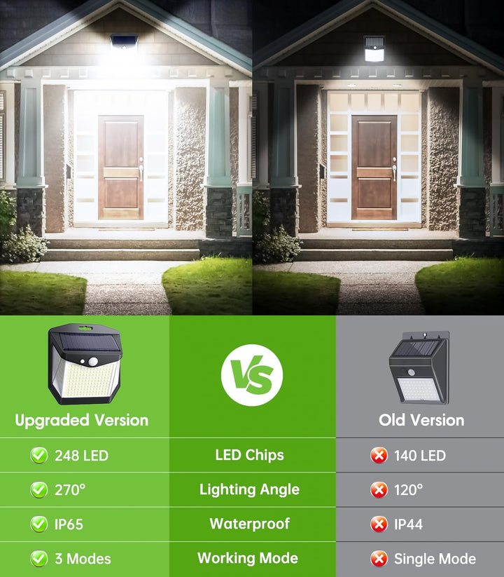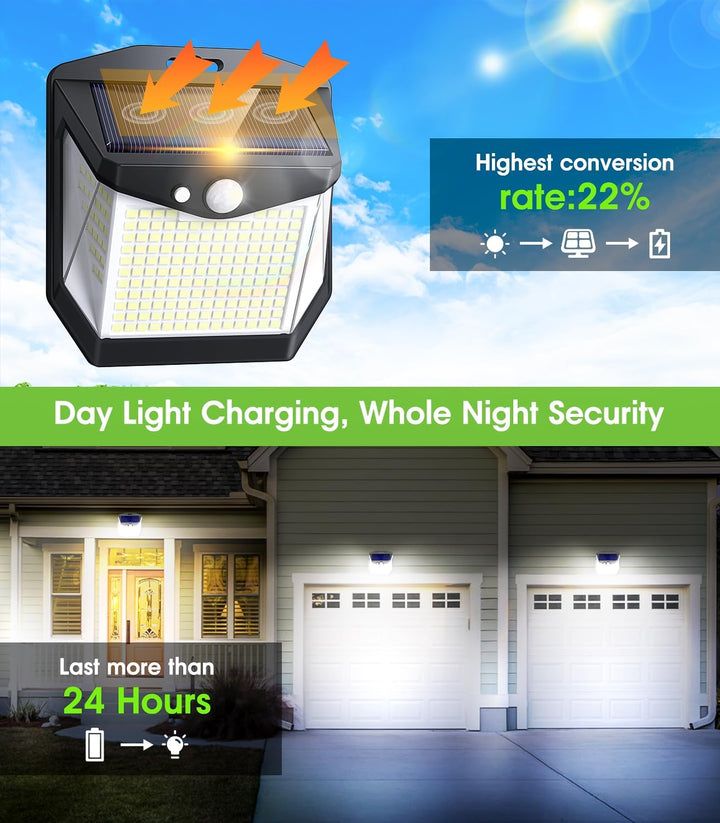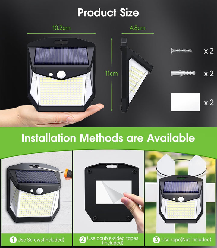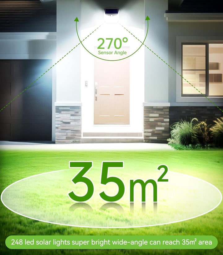 Light up your outdoor spaces with the 248 LED Solar Security Lights (2 Pack) — the perfect blend of power, efficiency, and durability. Each light delivers ultra-bright illumination through a triple-sided 270° beam design, providing full coverage for gardens, driveways, garages, and pathways. Equipped with intelligent motion sensors, these lights automatically switch between three smart modes to balance brightness and energy efficiency.