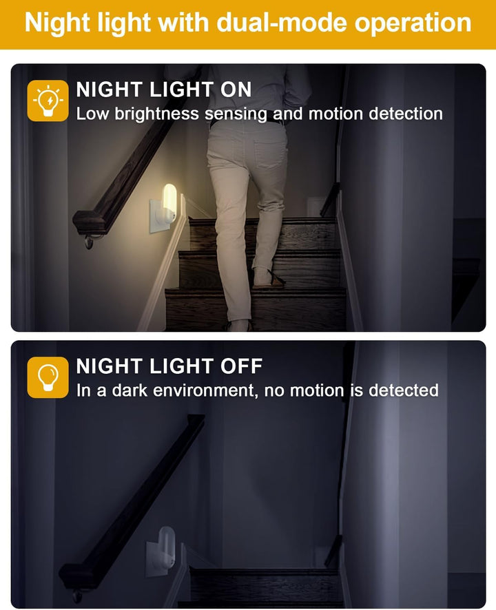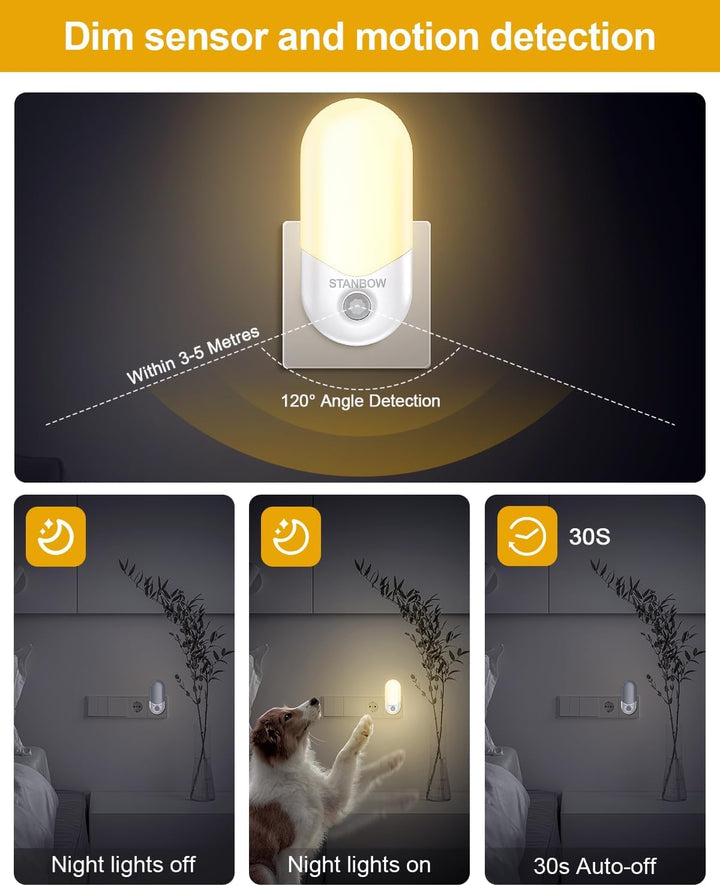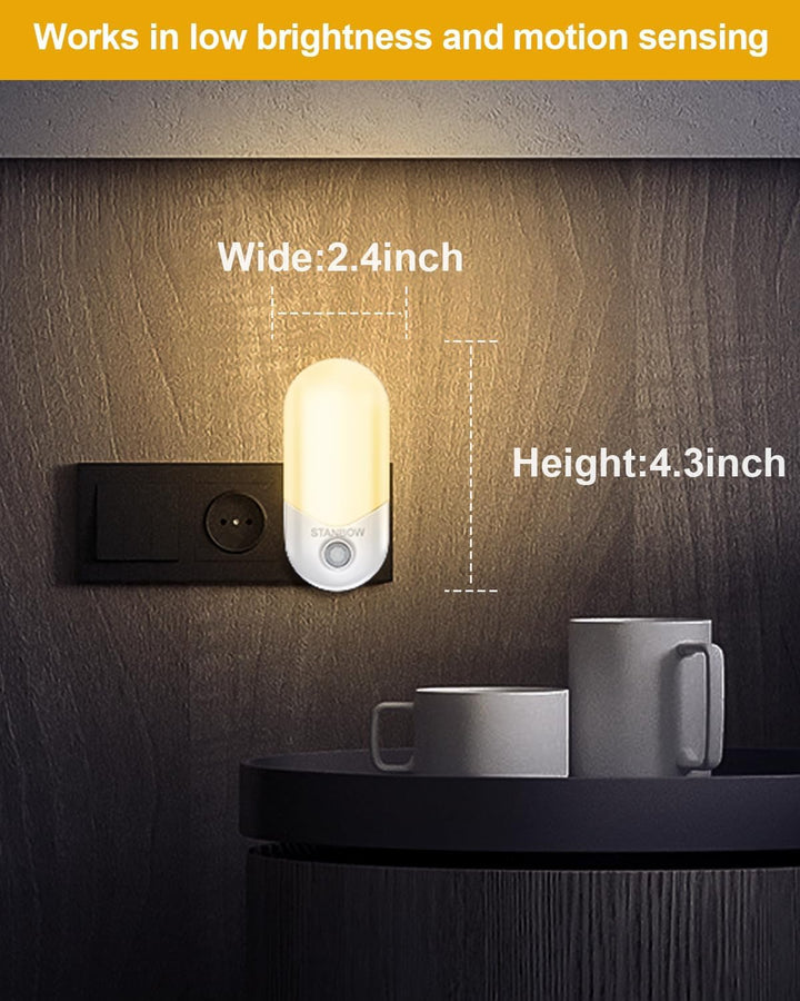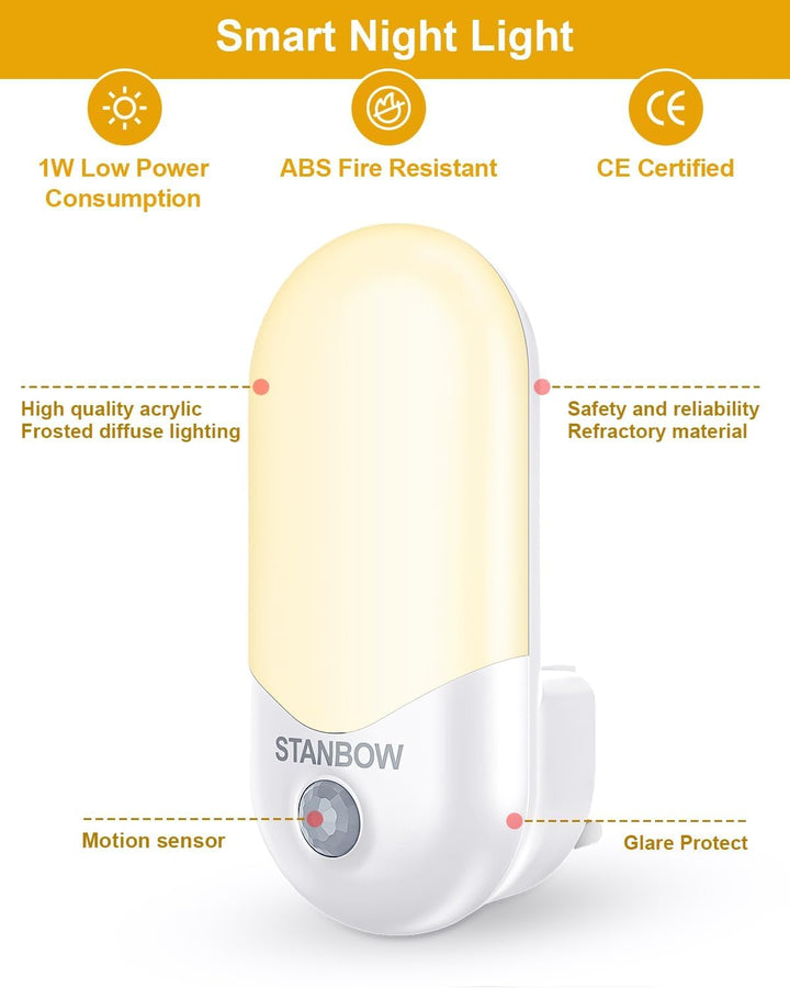 Bring safety and comfort to your home with the STANBOW Motion Sensor Night Light (2 Pack). Designed to provide warm, gentle illumination, these 3000K plug-in lights automatically turn on when movement is detected and switch off when the room is still — perfect for hallways, bedrooms, stairs, and kitchens.