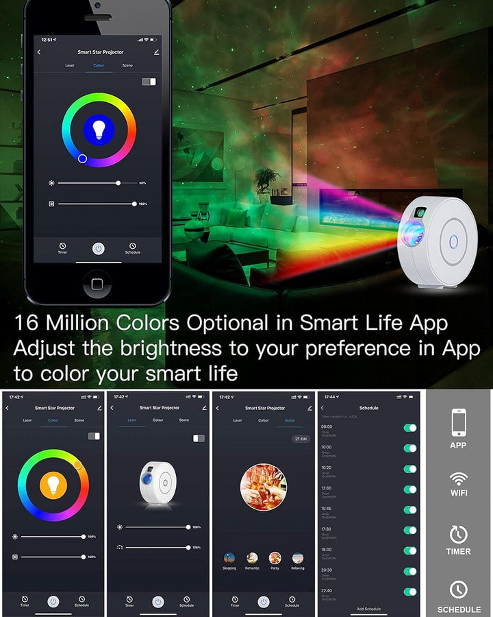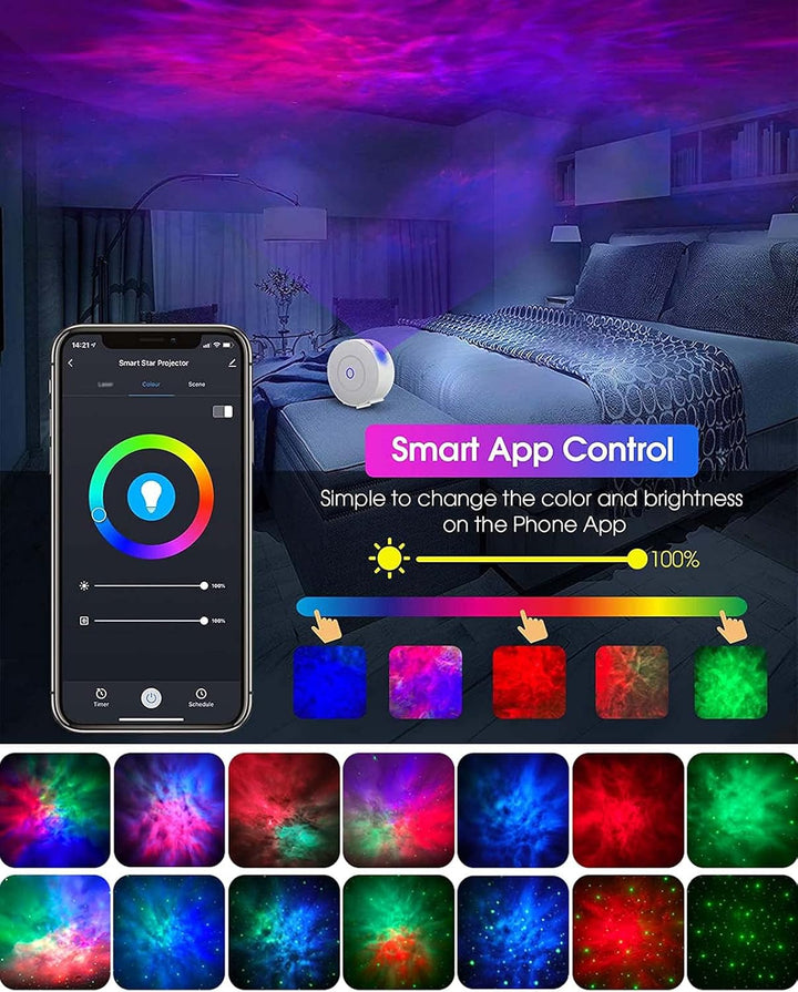 The Star Projector with App Control transforms any room into a mesmerizing galaxy with vibrant nebula clouds, shimmering stars, and 16 RGB color modes. Designed for kids and adults, this smart galaxy projector offers complete control through a mobile app, allowing you to adjust colors, brightness, rotation, effects, and timing with ease. It also supports voice control, making it compatible with smart assistants for hands-free operation.