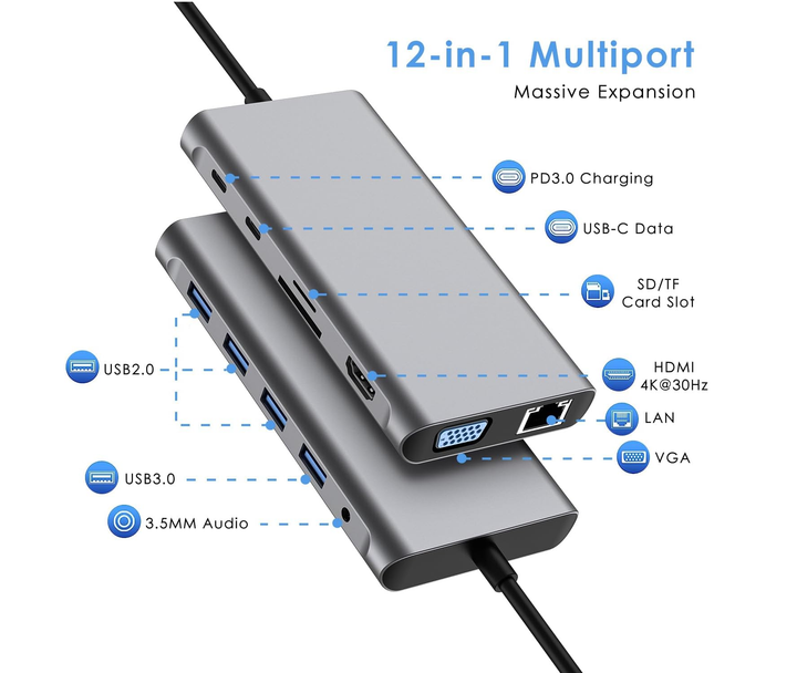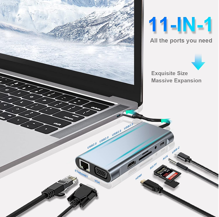 11-in-1 Expansion Hub: One adapter for video, power, data, and audio connectivity.