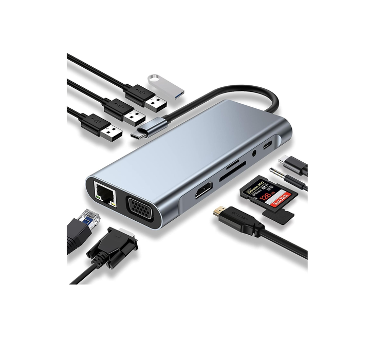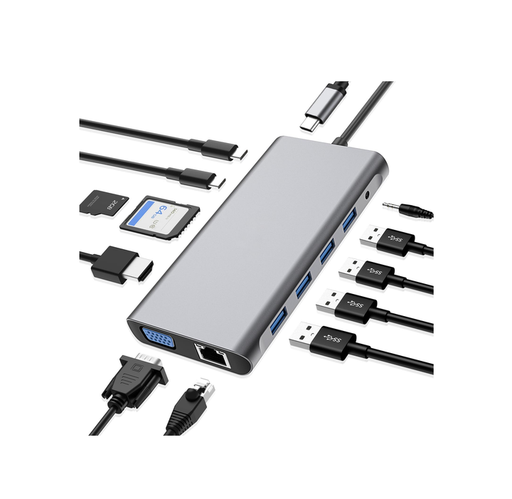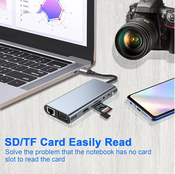 Transform your laptop into a powerful workstation with the 11-in-1 USB-C Docking Station — the ultimate all-in-one adapter for professionals, creators, and multitaskers. Designed to expand your device’s connectivity, this hub combines HDMI, VGA, USB 3.0, PD charging, Ethernet, SD/TF card slots, and a 3.5mm audio port in one compact, durable aluminum body.