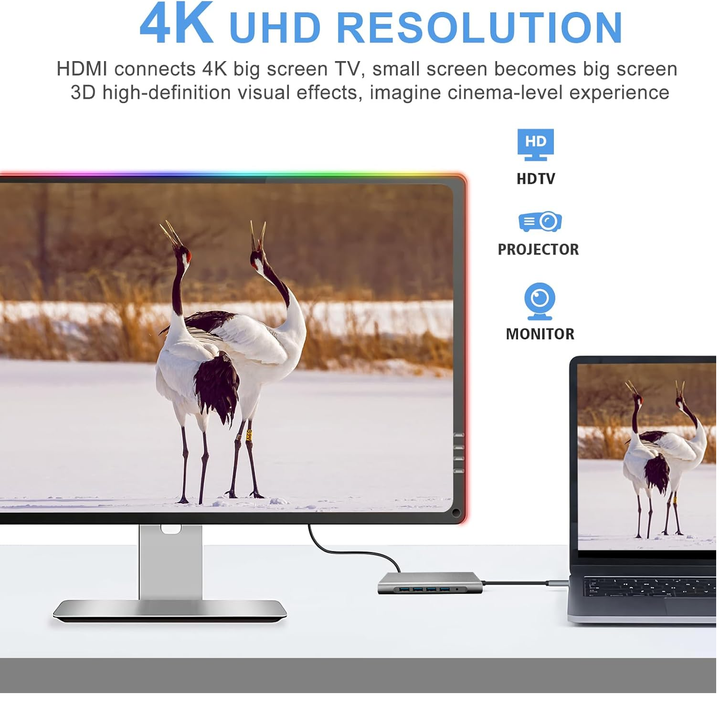 Compatible with MacBook Pro/Air, iPad Pro, Dell XPS, HP Spectre, Lenovo, Surface, and other USB-C laptops, this docking station offers universal versatility for both work and entertainment setups.