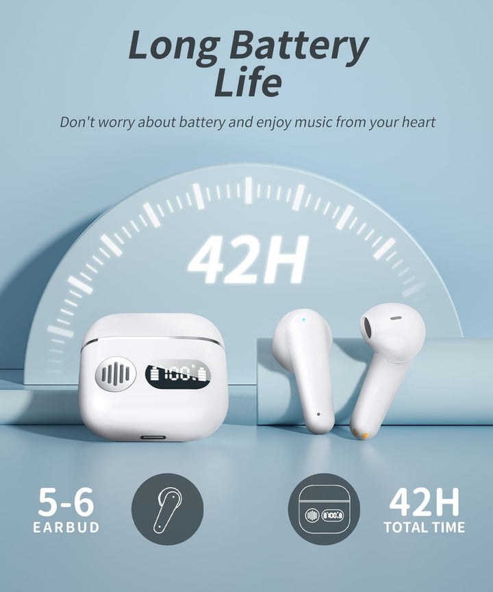 Equipped with Bluetooth 5.3 technology, these earbuds ensure faster pairing, stable connectivity, and crystal-clear calls with ENC & CVC 8.0 noise reduction, effectively reducing background noise by up to 98%. The dual LED display charging case lets you monitor battery life in real time, while the 48-hour total playtime keeps your music going all week long.