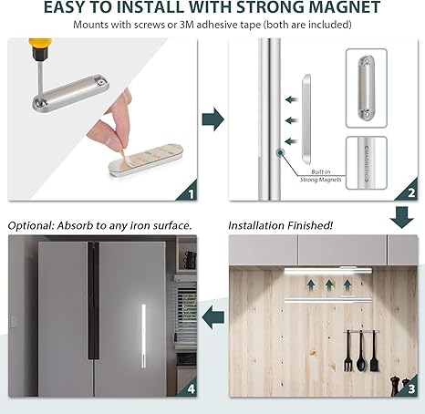 Installation is quick and hassle-free with the stick-on magnetic mount, allowing you to attach the light anywhere and remove it easily for charging. With adjustable modes and a sleek, compact design, this under-cabinet light offers powerful illumination while blending seamlessly with your home décor.
