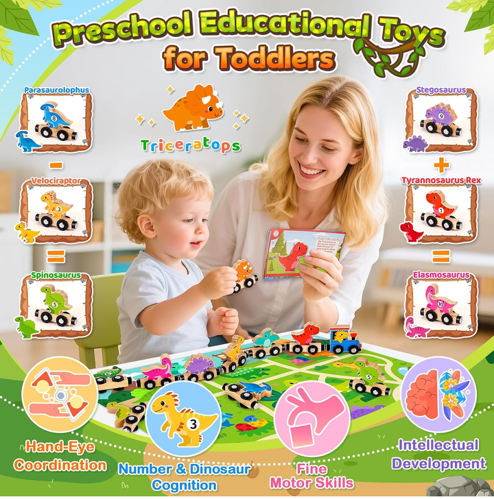 Crafted from high-quality wood and coated with non-toxic, child-safe paint, each piece is smooth, durable, and comfortable for toddlers to grasp. The bright dinosaur designs engage your child’s curiosity, while the train format introduces early concepts such as sequencing, matching, movement, and role-play. This Montessori-inspired toy promotes independent learning and supports essential developmental skills including fine motor coordination, problem-solving, and sensory exploration.