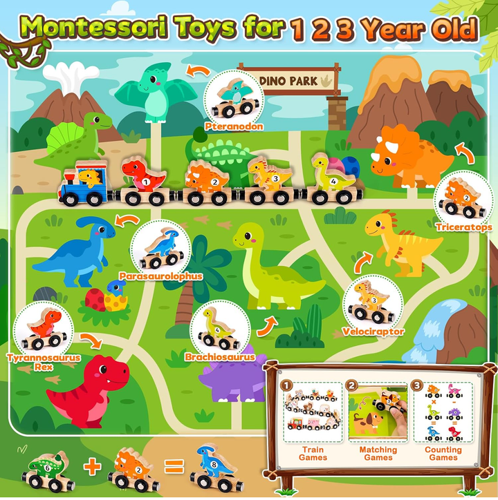 Montessori wooden toy combining dinosaurs with a magnetic train